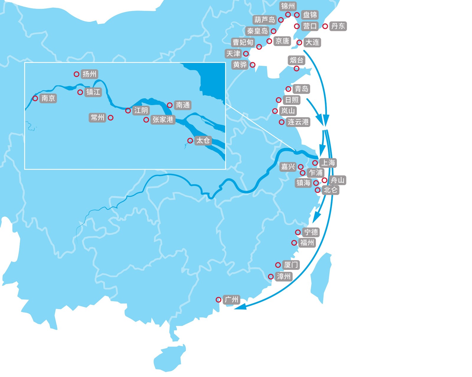 公司的境内航区运输业务,系通过直接购买、租赁等方式控制运力,并经营干散货运输船舶,在中国境内沿海、长江下游、珠江三角洲等水域航区为客户运输煤炭、铁矿石等干散货。